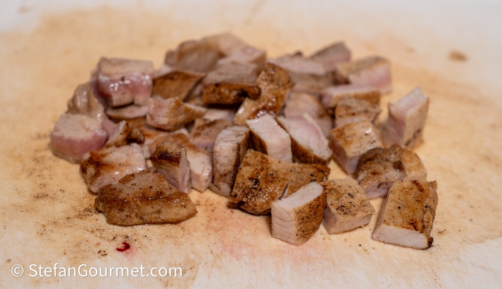 Reserve the drippings in the pan to add to the filling later. Dice the pork.