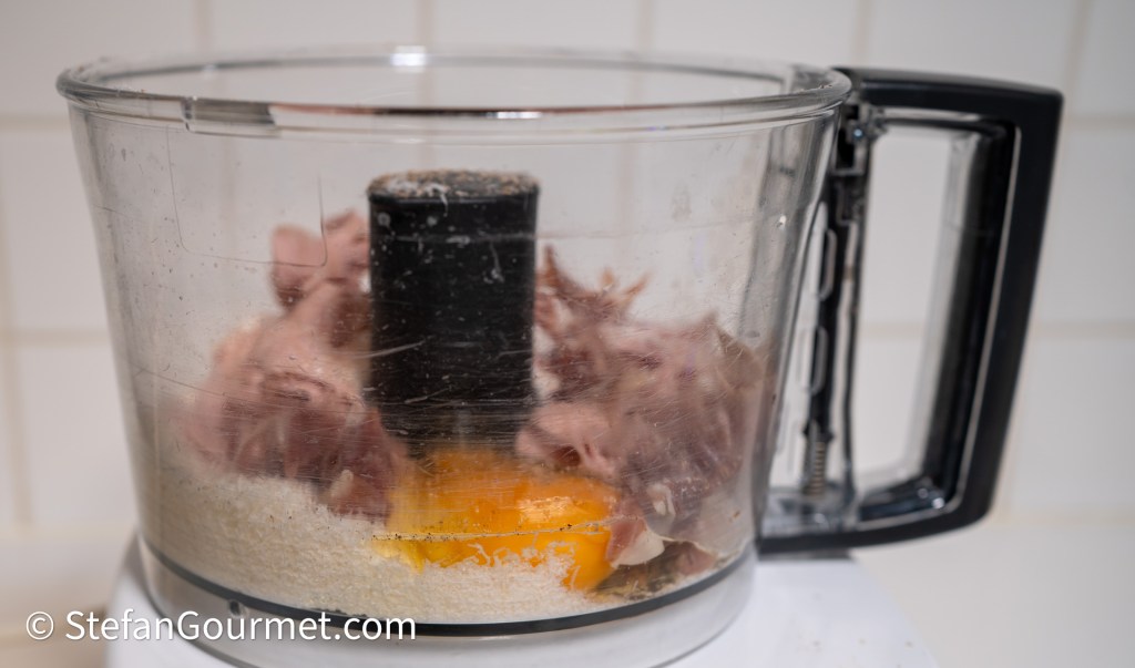 Place the diced pork in the bowl of a food processor together with the reserved drippings from searing the pork, 1 egg, 50 grams of chopped prosciutto, 50 grams of chopped mortadella, 50 grams of freshly grated parmigiano, a dash of freshly grated nutmeg, and some freshly ground black pepper.