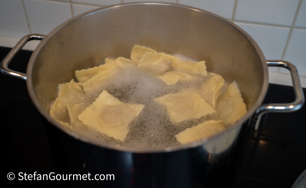 When the water boils, add salt and the ravioli. Boil them for 2 minutes only.
