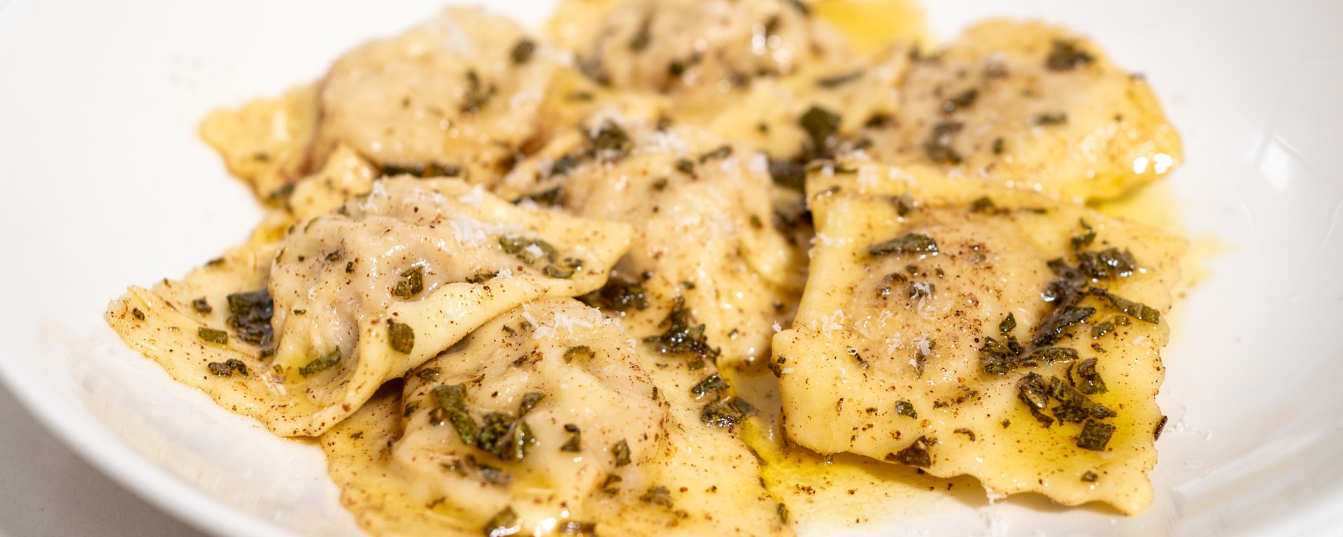 Serve the ravioli at once on preheated plates. Spoon any butter and sage that remains behind in the pan over the ravioli, and garnish with freshly grated parmigiano.