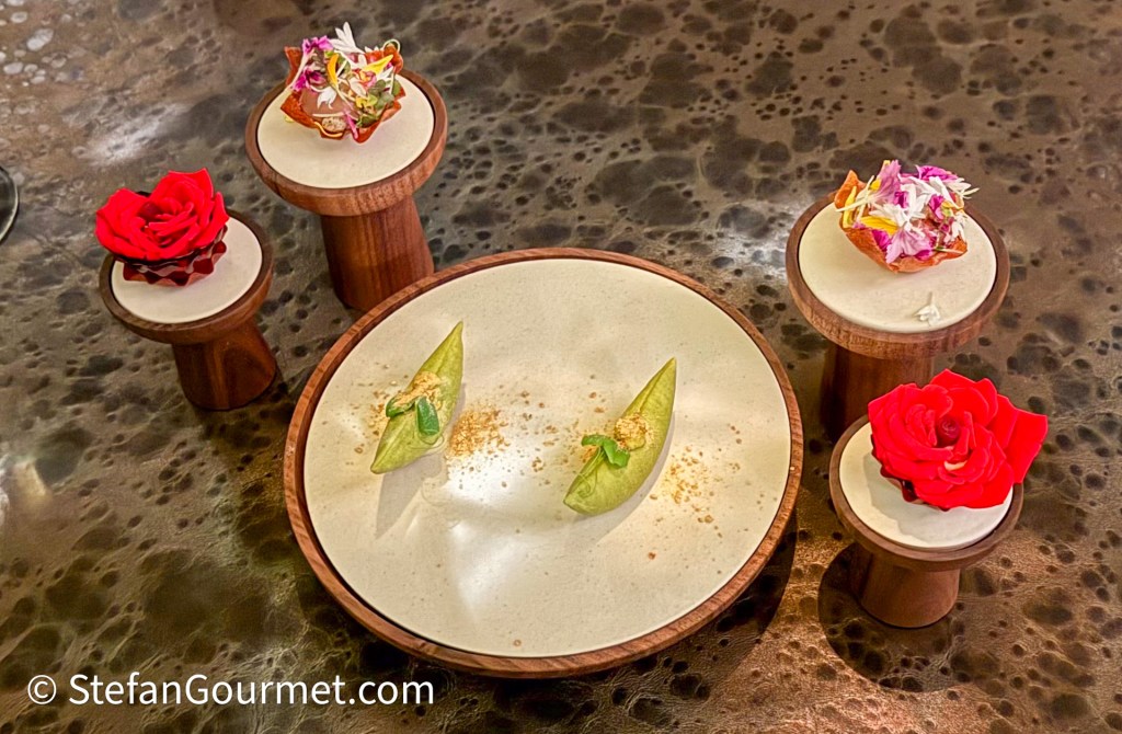 The snacks consisted of peas in pod with horseradish and young mustard, kohlrabi with verveine, and an edible rose with beetroot and lovage.