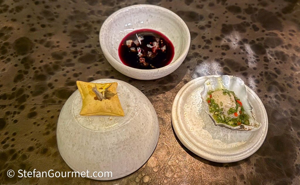 We continued with three appetizers that celebrated three of Librije’s suppliers: an oyster with a very nice sweet & sour dressing that complemented the oyster rather than overwhelming it, a crunchy pillow with smelt, and fermented red cabbage juice.