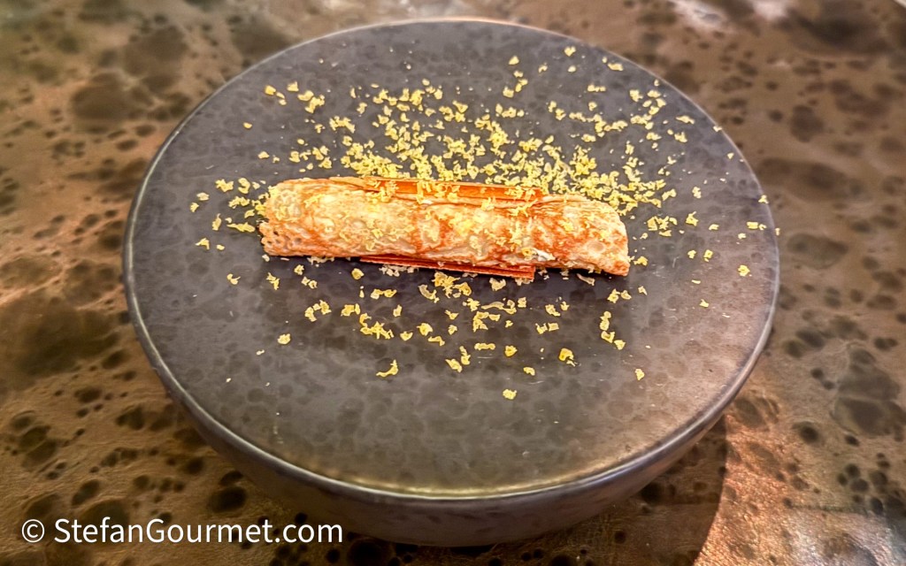 This was a good pairing for the pancake ‘from Giethoorn’, inspired by the pancakes that the chef’s mother used to make for him in his hometown of Giethoorn. However, this pancake was stuffed with a generous amount of excellent caviar, and sprinkled with dried, smoked, and shaved egg yolk. Delicious.