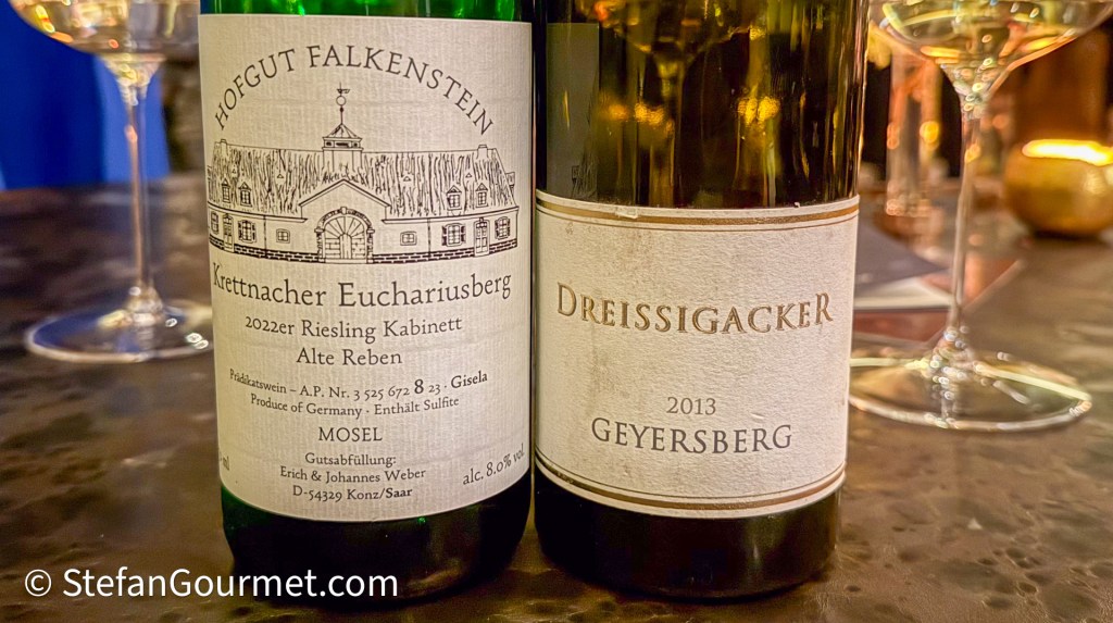 We moved on to two Rieslings for the next two courses. A 2022 Krettnacher Euchariusberg Riesling Kabinett by Hofgut Falkenstein from Mosel, Germany, and a 2013 Geyersberg Riesling by Dreissigacker from Rheinhessen, Germany. The Kabinett was a typical Mosel Riesling, light and balanced between sugar and acidity. The Geyersberg dry and more complex.