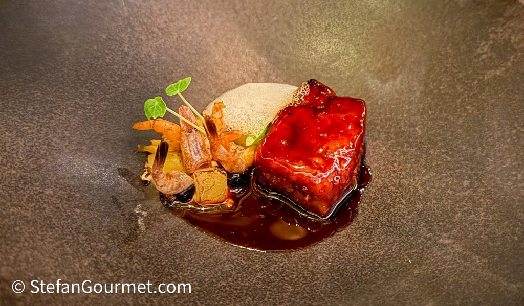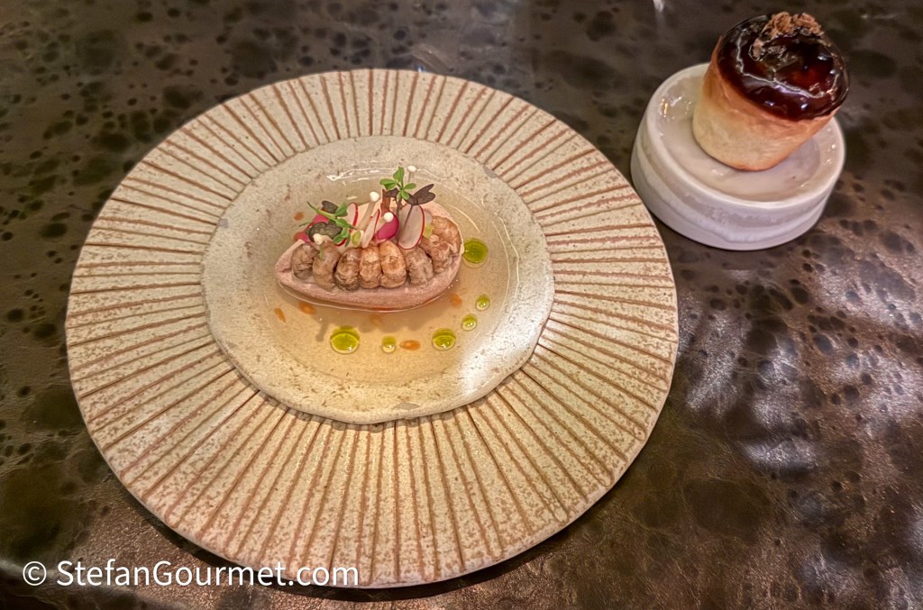 The Kabinett was the best pairing for one of the classic dishes of the chef: foie gras with grey shrimp, tomato juice, and kaffir lime, with a brioche lacquered with shrimp bisque. The Geyersberg was a bit too dry for the dish.