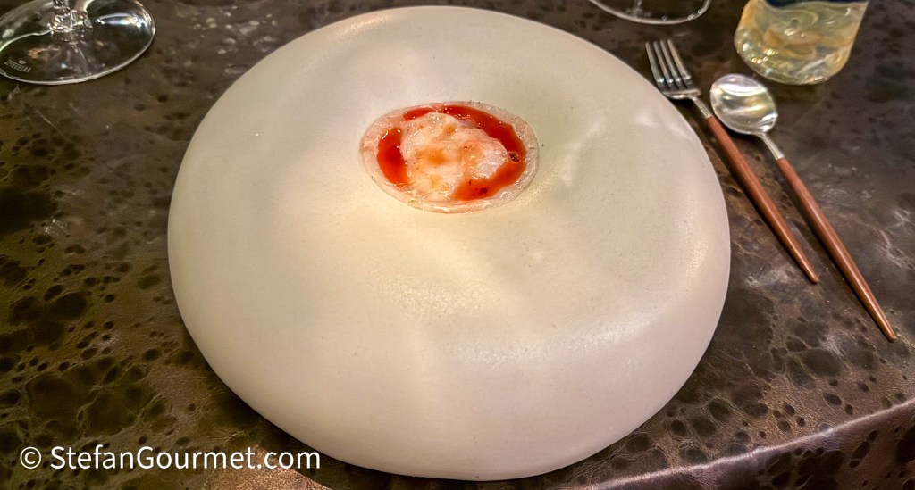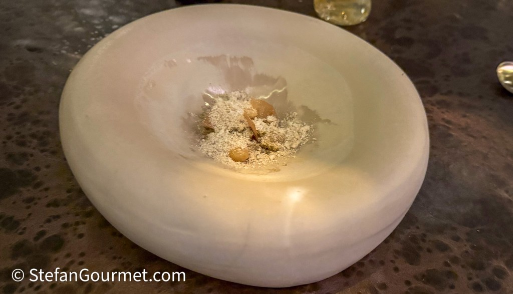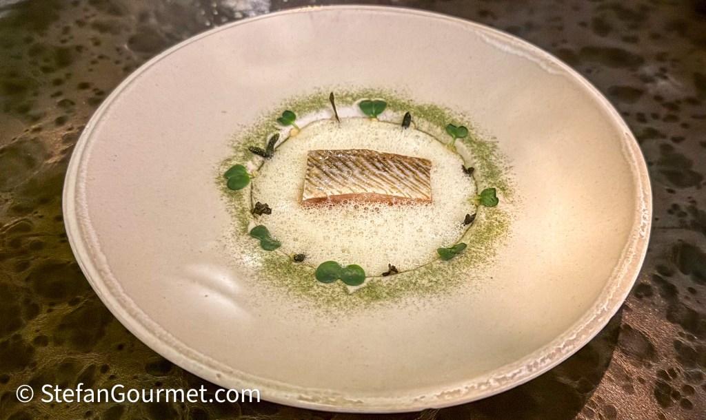 The next dish was vegan: eggplant with hazelnuts and passion fruit, a creation of sous chef Noah Wynants, with which he has won the San Pellegrino Young Chef award for North Europe and he is now going on to the finals. He calls it “Dutch Rendang”, to show that worldly flavors can be achieved with local ingredients. To be honest I do not think Rendang is a good description of the flavor, but it sure was delicious and a very good pairing with the Meursault.