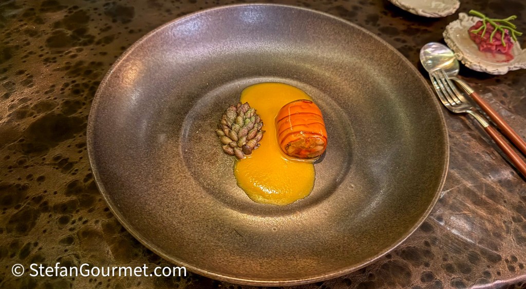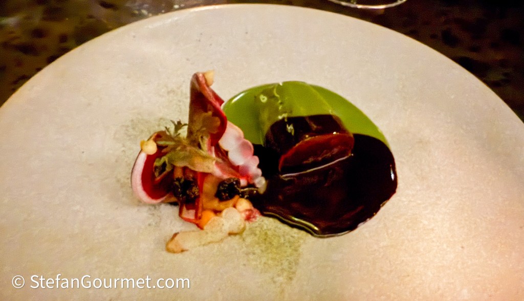 The vanilla is produced in the Netherlands and fermented until it gets a red color. The vanilla flavor was very elegant and complex, and complementing the langoustine very well. The langoustine had excellent texture; this was a wonderful dish.