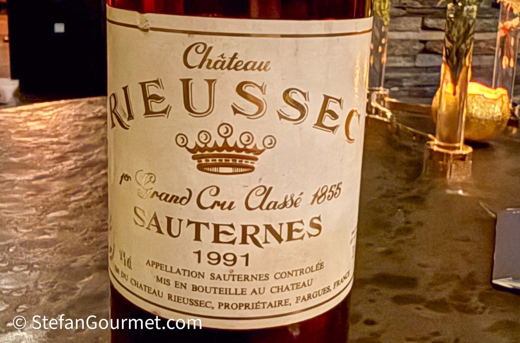Then we moved on to a Château Rieussec 1991 Sauternes. An older vintage and perhaps a bit past its prime, with a brown color and notes of saffron.