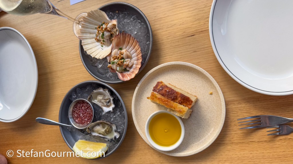 The restaurant is right next to the Lakes Entrance fishing fleet, and acquires the freshest seafood directly from them. Besides à la carte there are two tasting menus: 3 courses for AU$ 59 or 6 courses for AU$ 95 with wine pairing (AU$ 45 for 6 half glasses). We opted for the latter.