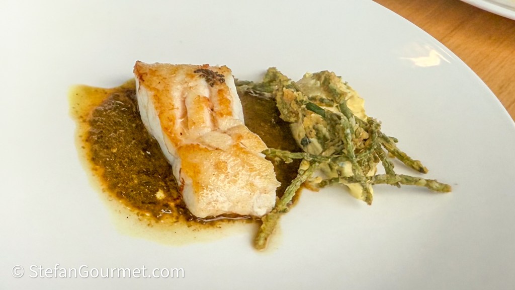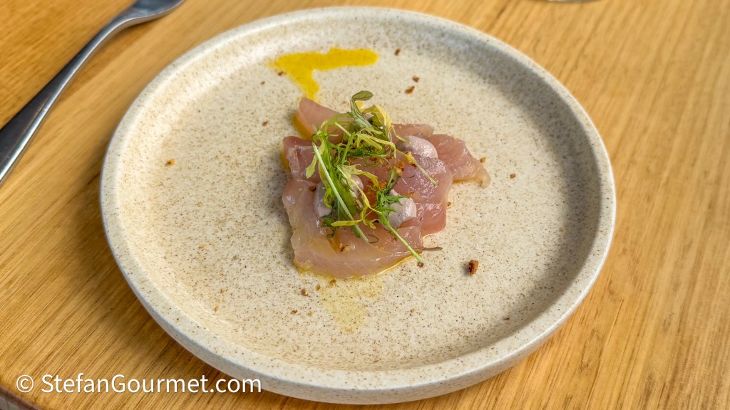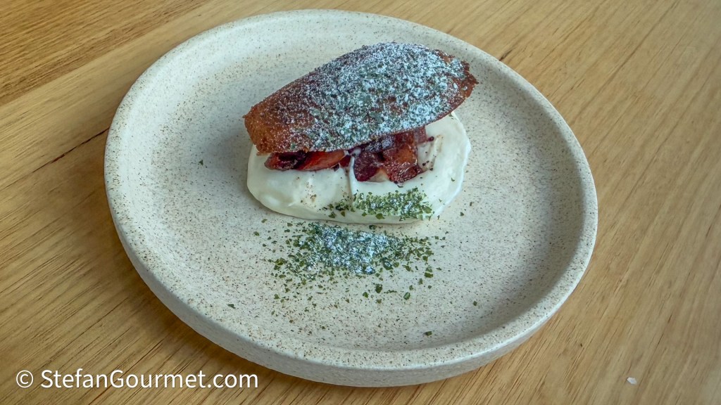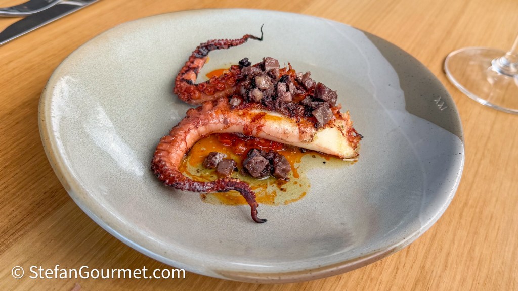 The menu continued with BBQ’ed octopus with capocollo (Italian charcuterie), harissa, and olive. The flavor of the condiment was terrific, but unfortunately the octopus was rather bland and very chewy. It seemed like the octopus had been BBQ’ed raw, while parcooking octopus to tenderize it first is absolutely necessary. With the sauce the flavor of the dish was still very nice, and an excellent pairing with the 2022 Narkoojee Pinot Noir from Glengarry, Victoria (Australia). Even though the wine was served slightly too warm, it was a great wine with velvety tannins and ripe fruit, and a surprisingly good pairing for the dish.