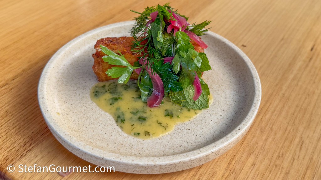 Next was a fish finger with herb salad, pickled onions, and hollandaise with herbs. The fish finger was filled with a mixture of fish and potato to give it a more tender and fluffy texture. This was paired very well with a 2023 Vickery Riesling from Eden Valley, South Australia. The herb salad and hollandaise gave a very nice tart contrast to the crispy and fluffy fish finger and the wine brought it all together.