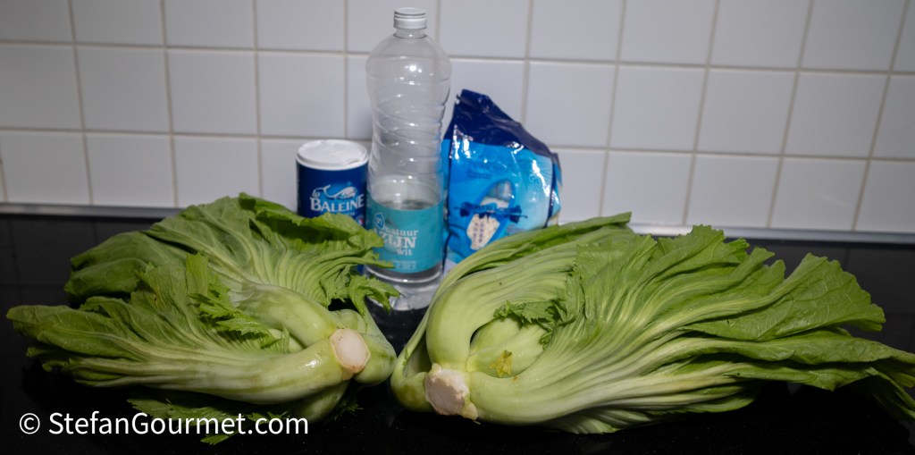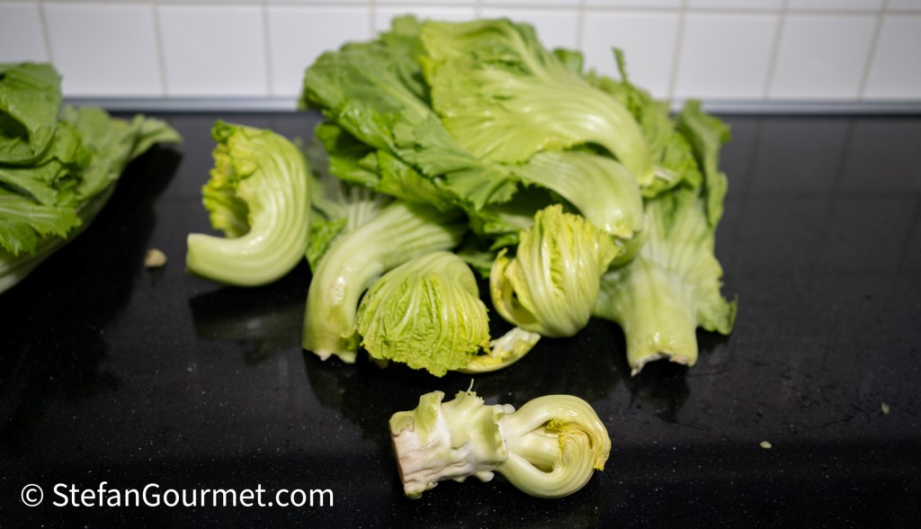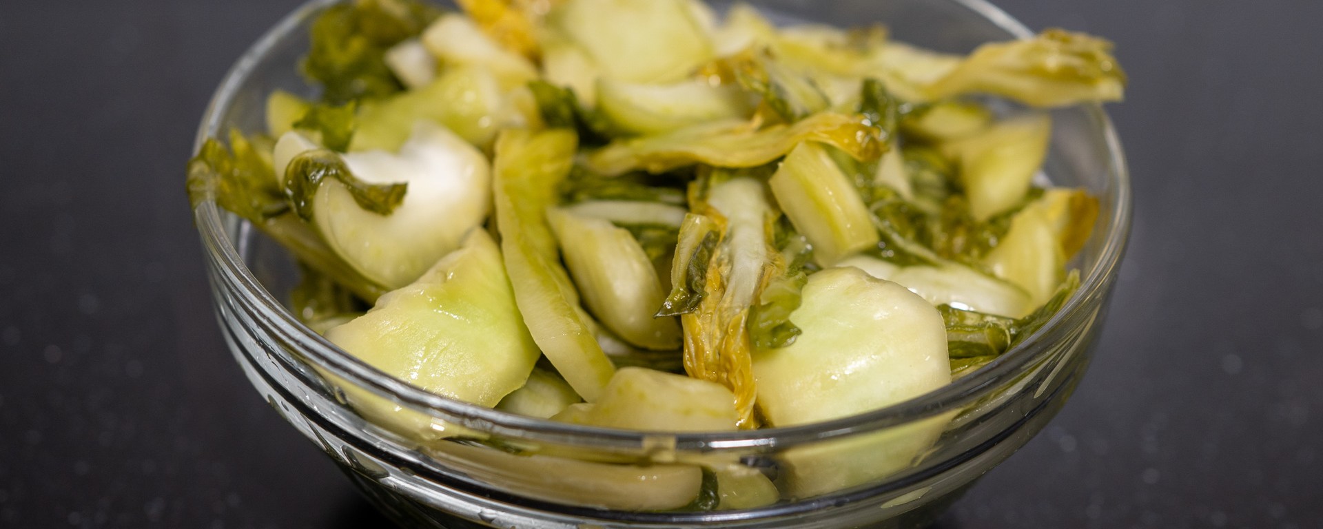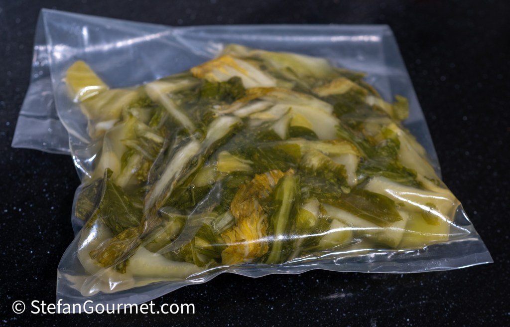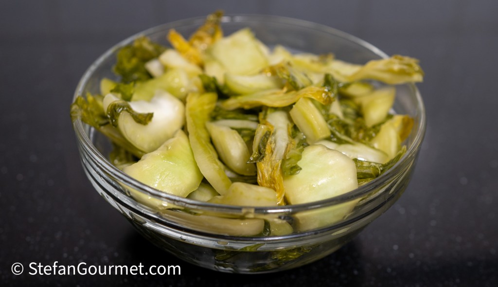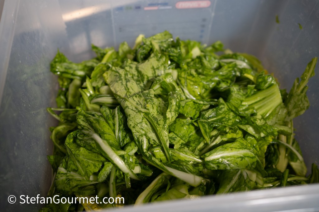 Thai pickled mustard greens (ผักกาดดอง / Pak Gad Dong / Phak Kat Dong) is an essential ingredient for Thai dishes like Khao Soi or Khao Ka Moo. It is basically an oriental version of sauerkraut. I don’t care so much for the store-bought vacuum packed version, and I liked it much better when I was in Thailand. The flavor there was more ‘fresh’. And so I decided to see if I could make it from scratch. It turned out that is quite easy; the hardest part is to source the fresh mustard greens. I found them at the Asian supermarket under the Chinese name Gai Choy. I used this recipe as the basis, with one improvement. I really liked the result; it was very similar to what I remember from Thailand. I provide a parametric recipe, so you can weigh the amount of mustard greens and then adjust the other ingredients accordingly. This recipe uses vinegar; I think it should also be possible to allow the natural fermentation process to make it sour. That would take more time.
