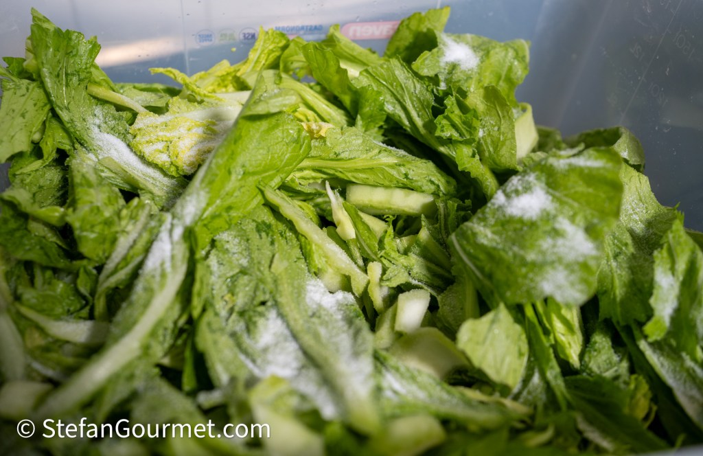 The recipe stated to rub the leaves with salt and to dissolve the salt in the vinegar. It was not clear if the salt to rub the leaves with was to be taken from the total amount of salt and dissolving the salt in the vinegar didn’t really work. So this way makes more sense to me, and the amount of salt in the result seemed correct to me.