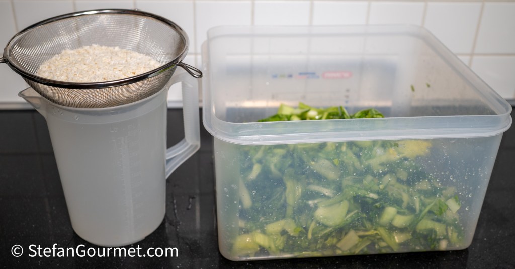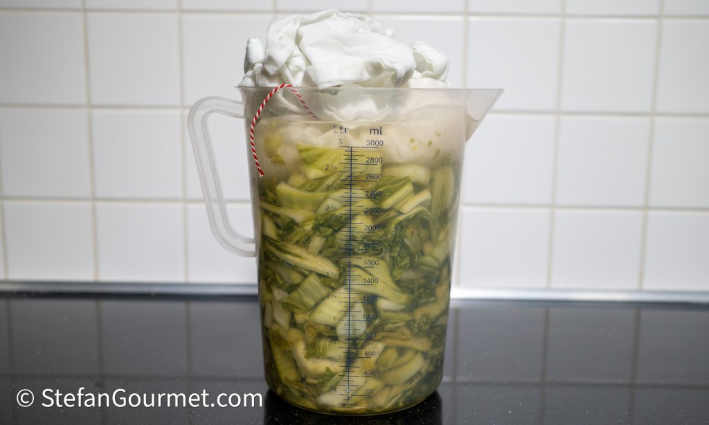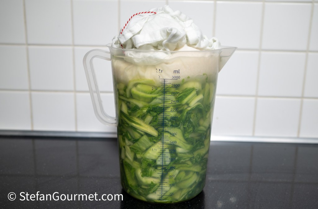 Put the mustard greens into a container, and pour the vinegar on top. Then add the water until the greens are barely covered. It is easiest to use a narrow type of container like the measuring jug that I used. Put the rice on a cheese cloth or old (but clean) tea towel, make a bundle, and tie it close with some twine or elastic band. Place this bundle on top, to make sure all of the greens are submerged in the brine.