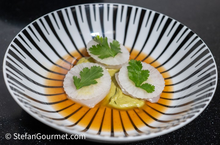 Scallops with Avocado, Daikon, and Tosazu Dressing