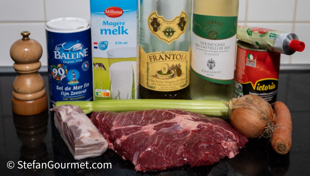 • 2023: 400 grams of coarsely ground beef. Traditionally in Bologna they used a cut called cartella, which is plate or skirt. If you can’t find it, or to mix, it is preferred to use tough cuts from the front or shoulder like brisket, blade steak, or chuck. It is allowed to mix different cuts. It is also allowed to use a mixture of beef (60%) and pork (40%, shoulder). It is allowed to chop the meat by knife rather than grinding it.