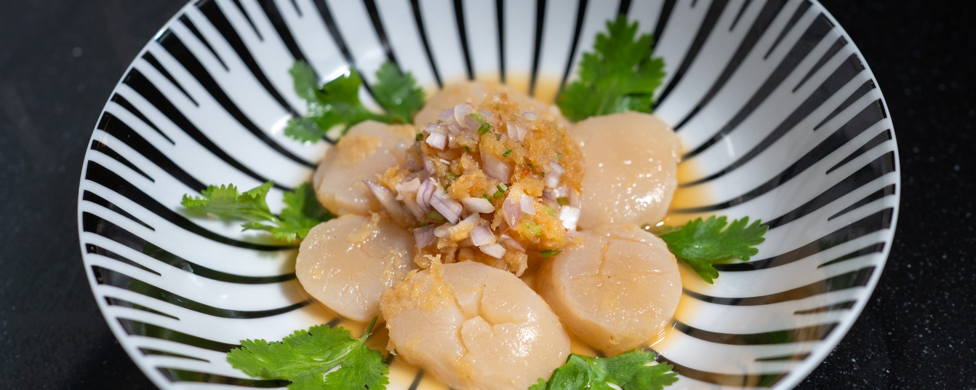 One of my favorite Thai dishes is eggplant salad, made with grilled long eggplant and a punchy dressing of lime juice, fish sauce, dried shrimp, chili, palm sugar, cilantro, and shallots. The Thai name of the dressing is nam yum. Together with my friend Melvin, I came up with the idea of transforming this into a scallop ceviche by replacing the eggplant with raw scallops. The original salad is typically served with a medium-boiled egg to add a creamy element, but since scallops already have a naturally creamy texture, we decided to leave the egg out. The result was delicious and has definitely earned a place in my repertoire. For an elegant presentation, I arranged the scallop slices in the shape of a flower: the solid components of the dressing form the ‘flower head’ at the center, surrounded by six scallop slices as ‘petals’, with cilantro leaves encircling the whole. I used 350 grams of scallops for this recipe, and the amount of dressing was just right for that quantity. If your scallops are significantly larger or smaller, you may want to adjust the other ingredients accordingly.