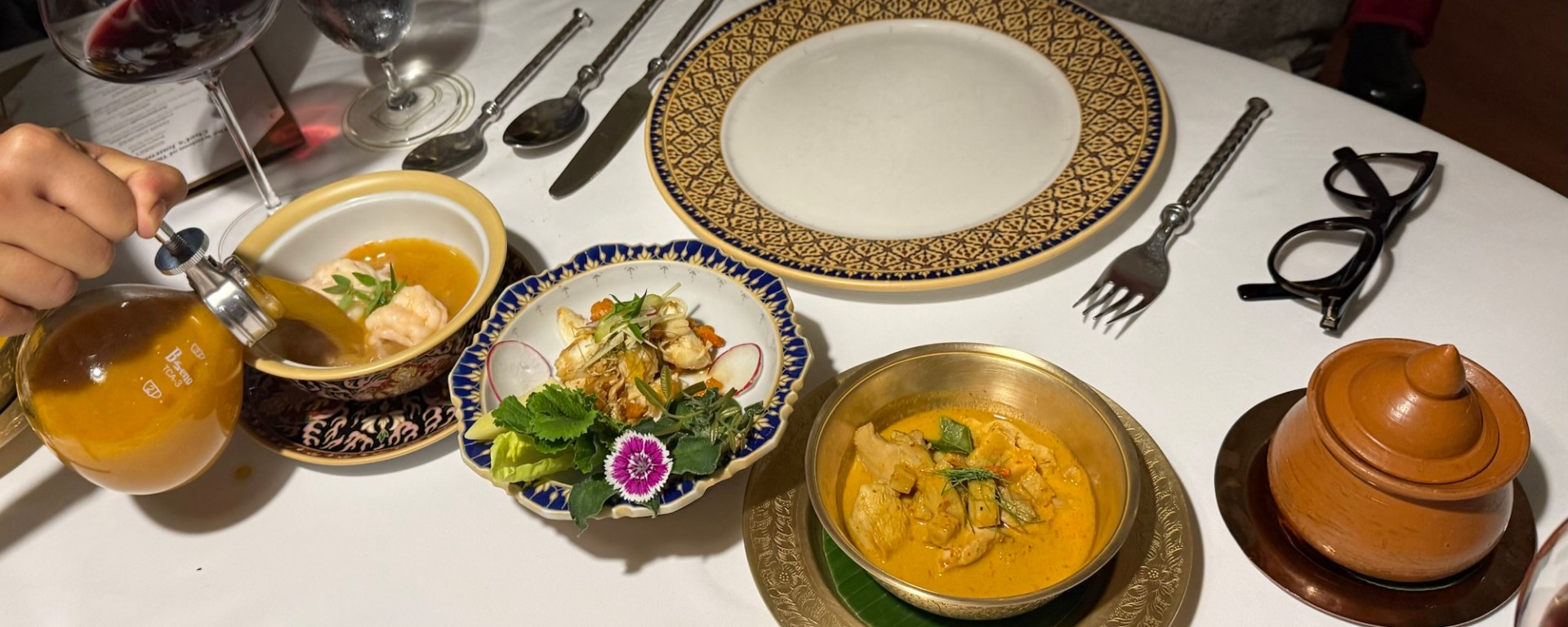 One of the dishes was a Tom Yum soup, with the broth infused at the table using fresh Thai herbs in a clear glass percolator, allowing guests to watch the process as it happened.