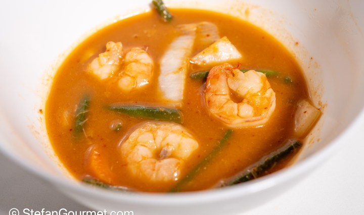 Gaeng Som is a water-based Thai sour curry that can also be described as a spicy seafood and vegetable soup. Literally Gaeng means curry and Som means sour. The curry paste is easy to make from scratch, as it is … Continue reading Gaeng Som (Thai Sour Curry with Shrimp)