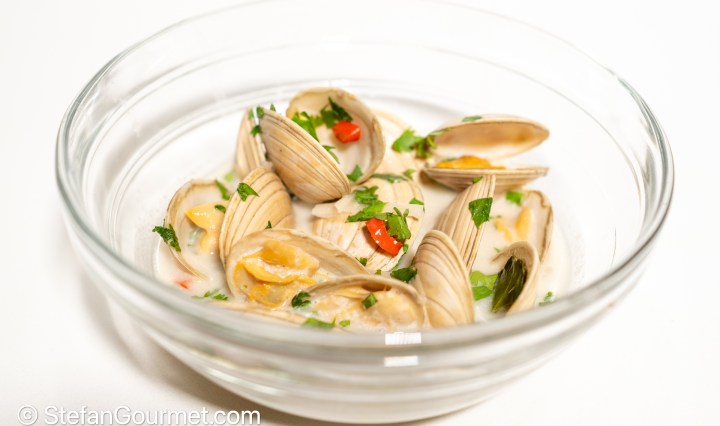 We love clams and we love Thai food, so I knew right away this would be a winner. I mostly followed Hot Thai Kitchen’s recipe, but substituted chicken stock with Thai fish stock. These Thai clams are wonderfully fragrant and … Continue reading Thai Coconut Lemongrass Clams (hoi lai tom ka)