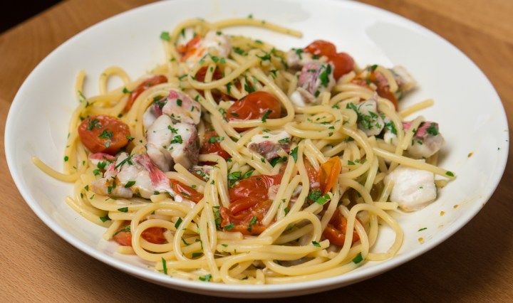 Girini (Crumbles of Dropped Pasta) with Rabbit, Samphire, and Cherry Tomatoes