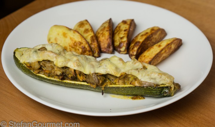 After the fava bean pods there were more leftovers to use up: the meat still attached to the bones from making chicken stock from what was left of the chicken whose legs we had with the fava beans. Although most … Continue reading Zucchini Stuffed with Leftover Chicken