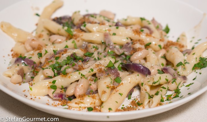 Fresh Pasta with Red Onion, White Beans, and Pecorino (Fileja con cipolla di Tropea, Poverello bianco e pecorino del Poro)
