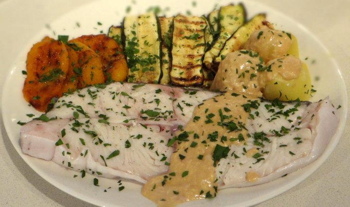 Halibut is not a fish that is easily available around here, and therefore I had not tried to prepare it sous-vide yet. So when I saw some at the market in Amsterdam I picked up a nice slice to try and cook sous-vide. Halibut is a flat fish like flounder, sole, and turbot, but it is a hell of a lot bigger so in most cases you don’t buy the whole fish but just a slice. I decided to serve it with a sauce made from white wine, fish stock, and cream. Served with potatoes and roasted vegetables it was a simple but nice meal, and it was no surprise that the halibut sous-vide was cooked to perfection: very succulent and tender.