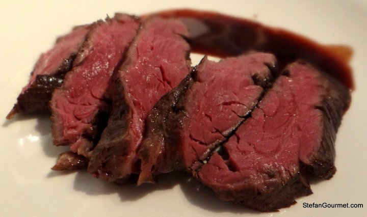 Hanger Steak is a lesser known but very flavorful cut of beef. It has so much flavor because it comes from the diaphragm that is needed for breathing, and has therefore had a lot of use in the life of the steer or cow. Hanger steak is called onglet in French, and longhaas or karweivlees in Dutch. It is best when served medium rare, but it can be slightly tough when prepared like a regular steak. With sous-vide we can fix this, because we can cook it for a longer time without taking it over medium rare or we can apply the technique that I have called warm aging.