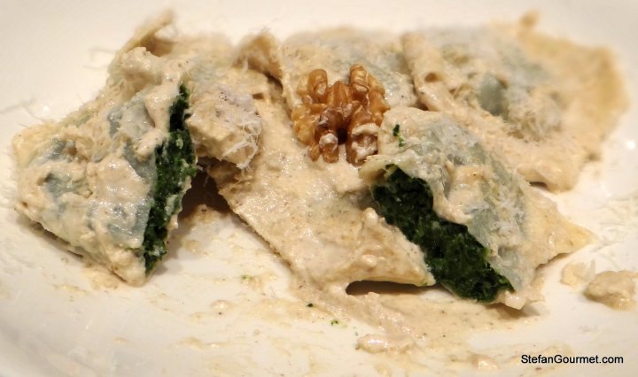 In Piemonte ravioli are called agnolotti and should contain meat, whereas in Liguria ravioli are called pansoti (or pansotti) and do not contain meat. Instead they are stuffed with a mixture of cheese and greens. The traditional mixture of greens is called “preboggion”, which refers to greens found growing in the wild on the Ligurian coast. Pansoti are often served with a walnut sauce, the same as I used for gnocchi a few weeks ago. The traditional cheese is called prescinsêua and is a fresh cheese that is a cross between ricotta and yogurt. The word pansoti is derived from the Ligurian word “pansa” (pancia in Italian), which means belly or paunch. Pansoti can have different shapes, but they should be ‘paunchy’. Continue reading “Pansoti con Salsa di Noci”