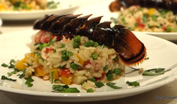 All the recipes I could find for lobster risotto did not use the lobster shells to make lobster stock to use for the risotto. They were simply a plain risotto with a lobster served on top. And so I decided to create my own recipe for lobster risotto and it turned out spectacular! I decided to cook the lobster tail sous-vide because that will keep it amazingly tender, but if you don’t have sous-vide equipment you can simply boil the lobster tail as usual and still obtain a wonderful dish. Because live lobsters are not a cheap ingredient this is something for a special occasion or a dinner party where you are looking to impress your guests. This risotto is served with the lobster tail on top, delicious lobster meat mixed in with the rice that has a wonderful lobster flavor from the stock, as well as peas, tomato, and yellow bell pepper for lovely colors. This dish has a nice contrast between the creamy rice and crunchy vegetables. Continue reading “Lobster Risotto Like No Other”