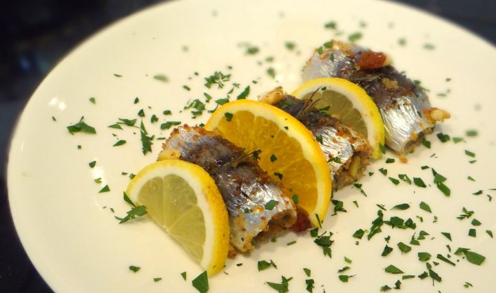 Apart from the fennel balls, I prepared another antipasto for my Sicilian dinner: Sarde a Beccafico. We really liked this dish when we had it at Tischi Toschi, and I copied the presentation from there. Sarde a Beccafico can be served either as antipasto or as secondo (main course). Sardines are stuffed with bread crumbs, raisins, anchovies, parsley, pine nuts, sugar, and baked in the oven with some orange juice. This dish is very tasty and easy to prepare if you ask the fishmonger to turn the sardines into fillets for you.