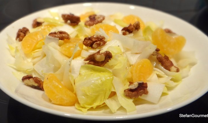 A witlof salad with mandarins and walnuts is a very homey Dutch dish, that is often made with canned mandarins and store-bought dressing. As such it is okay but nothing special. With a few touches I’ve transformed it into something a lot better: using fresh mandarins rather than from a can, toasting the walnuts, and making my own dressing with fresh mandarin juice and zest, honey and walnut oil. Continue reading “Belgian Endive/Witlof/Chicory Salad with Mandarins and Walnuts”