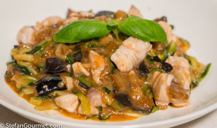Zoodles are noodles made from zucchini. You make them with a gadget called a spiralizer. There are electric ones as well has hand-operated models. I got one of the latter after reading ChgoJohn’s blog post about the spiralizer he had … Continue reading Zoodles with Fish and Eggplant Ragù (Tagliatelle di Zucchine al Ragu di Pesce e Melanzana)